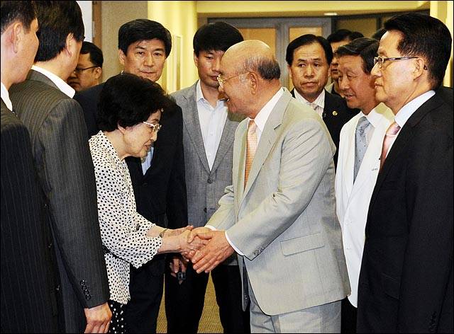 | ▲ 14일 오전 서울 신촌 세브란스병원에 입원중인 김대중 전 대통령을 병문안 온 전두환 전 대통령이 이희호씨에게 "아이고, 얼마나 고생이 많으십니까"라며 손을 잡고 위로하고 있다. 2009.8.14 |
