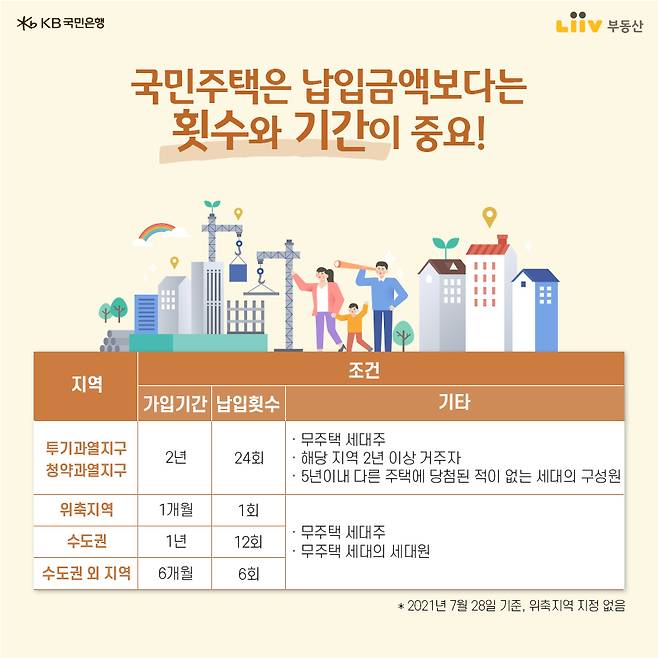 투기과열지구와 청약과열지구에 위치한 국민주택에 청약을 넣을 경우 청약통장 가입기간 2년, 납입횟수 24회가 돼야 1순위 조건에 충족됩니다. 그 외 위축지역은 가입기간 1개월·납입횟수 1회, 수도권 가입기간 1년·납입횟수 12회, 수도900px권 외 지역 가입기간 6개월·납입횟수 6회라는 기준이 있습니다.