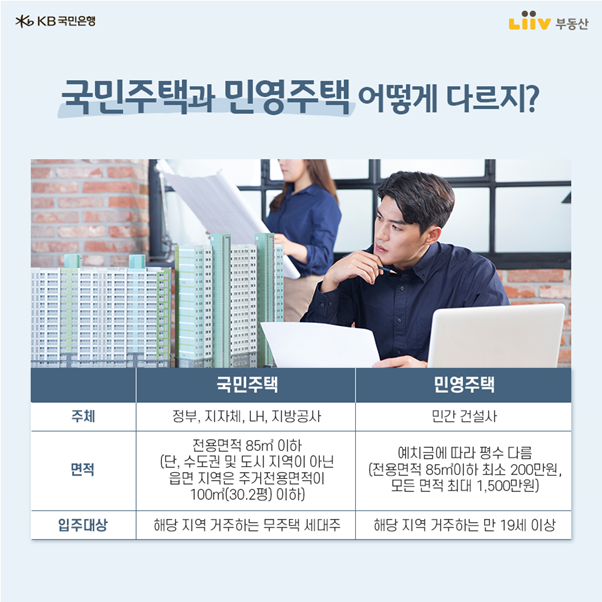 청약을 넣으려고 보니, 국민주택과 민영주택이라는 선택지 중 무엇을 선택해야 하나 고민되실 텐데요. 국민주택은 정부, 지자체, LH, 지방공사가 건설하는 주거전용면적 85㎡(28평) 이하 주택을 뜻합니다(단, 수도권 및 도시 지역이 아닌 읍면 지역은 주거전용면적이 100㎡(30.2평) 이하). 행복주택, 임대주택 등의 주거시설이 대표적인 사례죠.