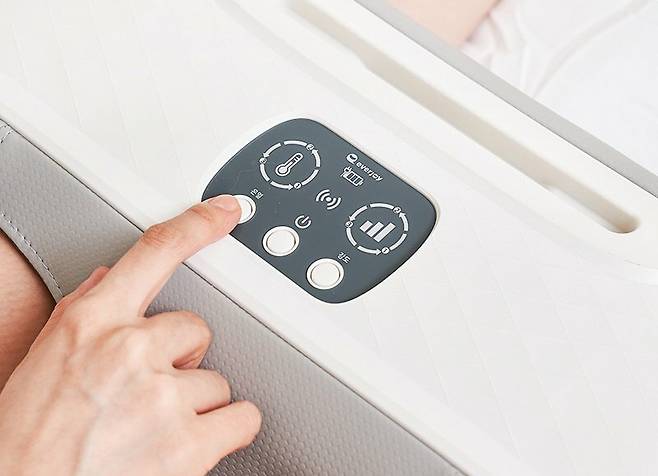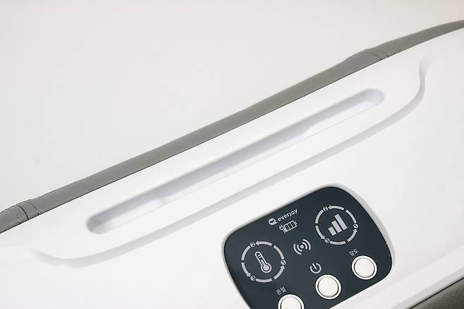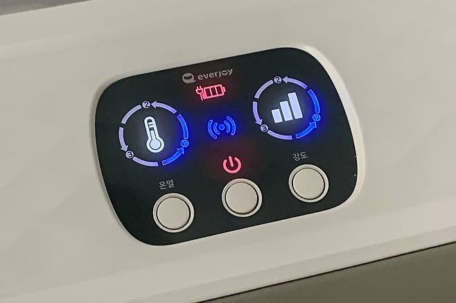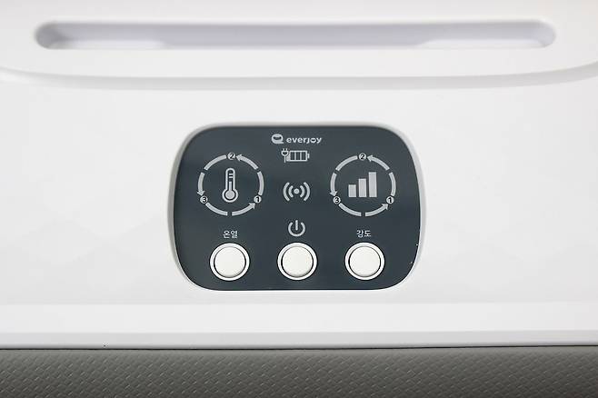 윗면의 가운데에는 조작부가 있는데, 가운데 전원 버튼 양쪽으로 온열 버튼과 강도 버튼이 있고 그 위로 설정 상태를 나타내는 그림이 자리 잡고 있다. 온열 버튼과 강도 버튼 위에는 각각 온도와 강도 설정 표시가 있고, 전원 버튼 위에는 배터리와 진동 표시가 위치해 있다.