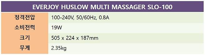 휴슬로 멀티 무릎 안마기 SLO-100은 큼직한 골판지 박스에 담겨있다. 구성품은 안마기 본체와 전원 어댑터, 사용 설명서로 이루어져 있다.