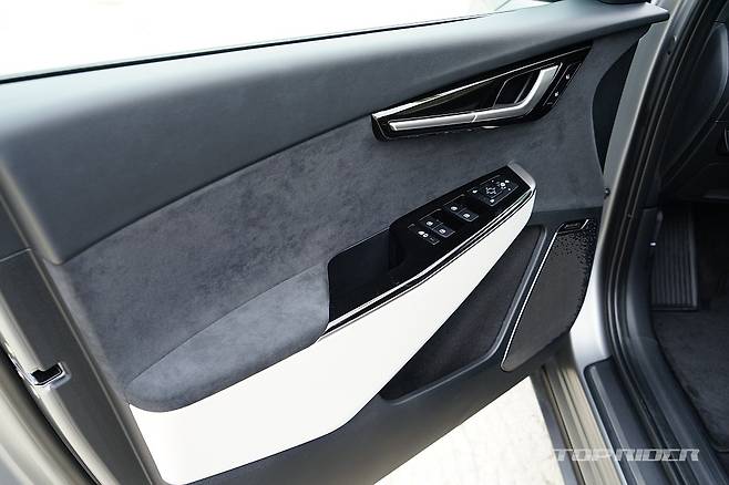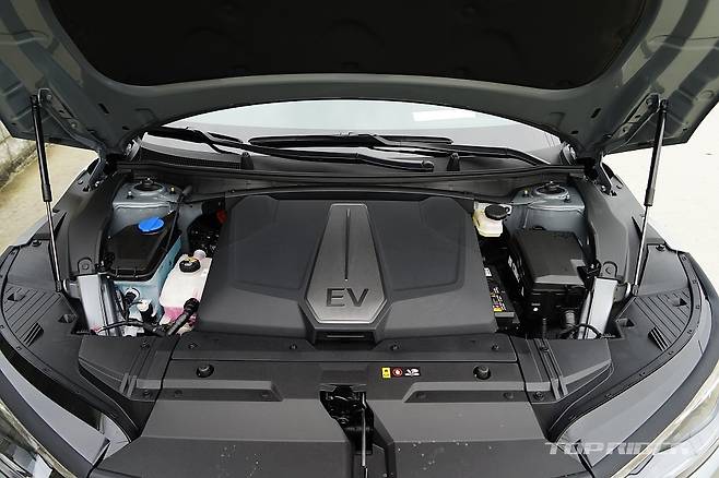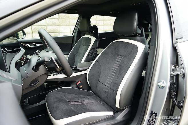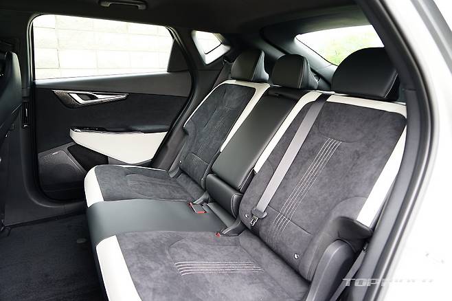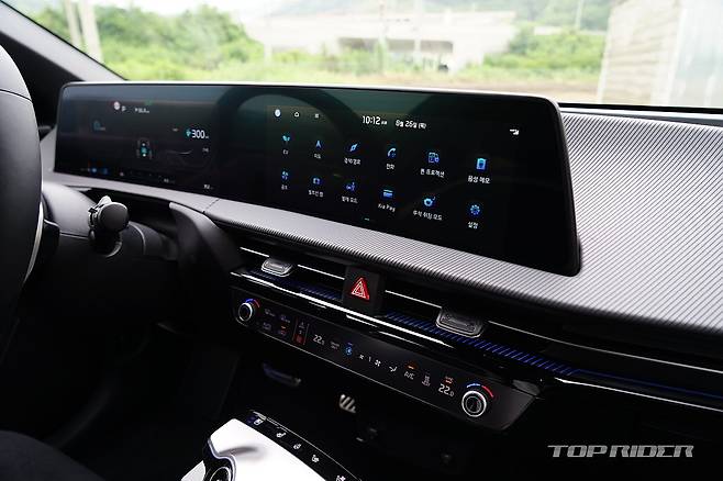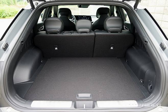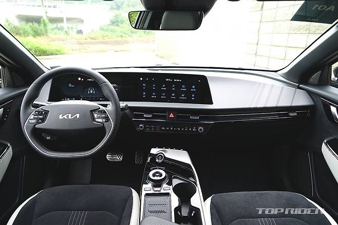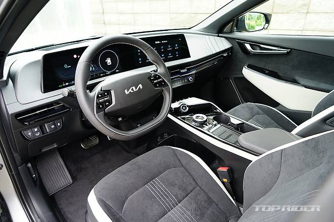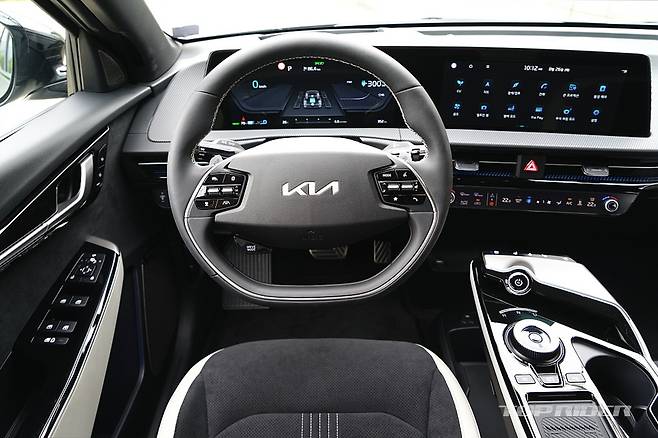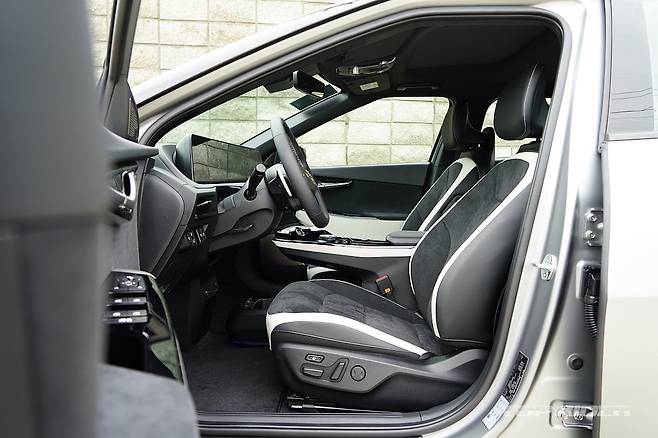 실내 디자인은 최근 출시된 기아의 신차와 유사한 구성이다. 파노라믹 커브드 디스플레이와 공조장치 조작부는 K8과 동일해 보인다. 시트를 가장 낮게 위치시키면 아이오닉5 대비 대시보드가 낮게 느껴진다. 1열 시트 후면부의 플라스틱 소재는 고급감을 낮추는 요소다.