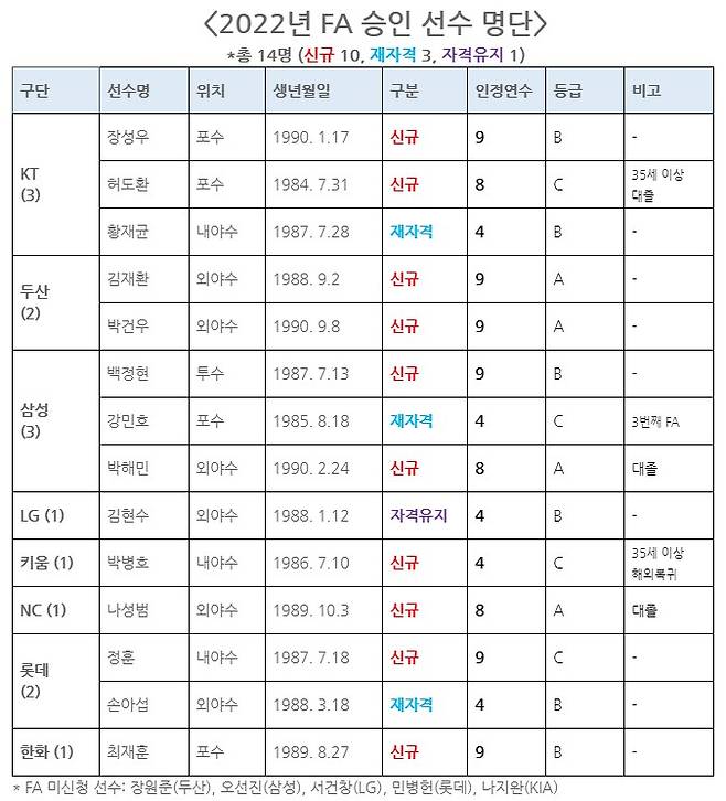 2022년 FA 승인 선수는 KT 장성우, 허도환, 황재균, 두산 김재환, 박건우, 삼성 백정현, 강민호, 박해민, LG 김현수, 키움 박병호, NC 나성범, 롯데 정훈, 손아섭, 한화 최재훈 등 총 14명이다.