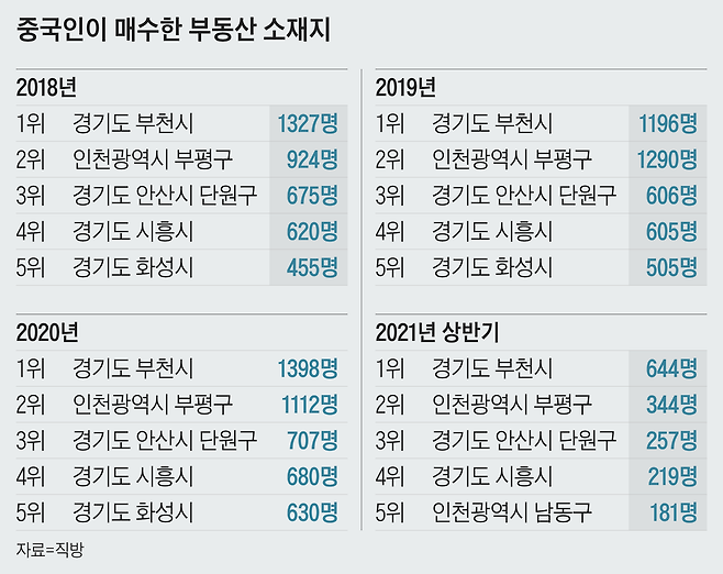 올해 들어 7월까지 중국인이 가장 부동산을 많이 산 곳은 경기도 부천이었다. 이어 인천 부평구, 경기도 화성, 경기도 시흥, 인천 남동구 순이었다. 수도권 서남부 지역에 대한 선호도가 높은 것으로 분석된다.