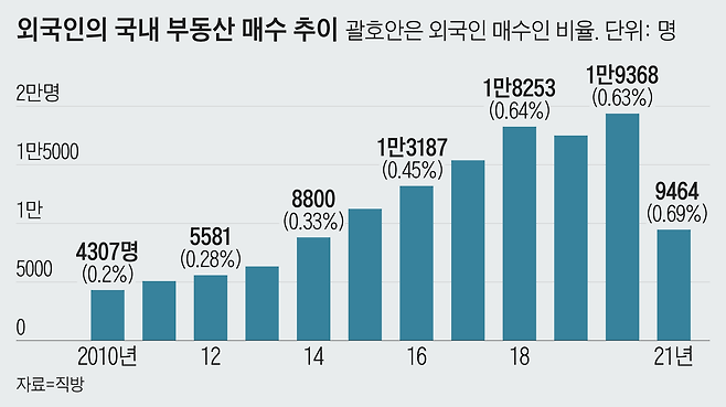 17일 부동산 정보업체 ‘직방’이 법원 등기정보광장 통계를 분석한 결과, 작년 국내에서 부동산을 산 외국인은 1만9368명으로, 전체 거래의 0.63%를 차지했다. 2010년 4307명에서 작년 1만9368명으로 10년 만에 4배 이상으로 늘었다. 비율로 봐도 2010년 0.20%에서 매년 꾸준히 늘어나는 추세다.