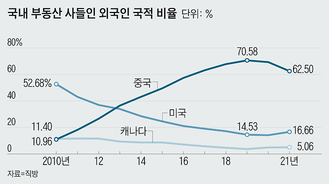 중국인은 2013년부터 9년째 외국인 매수 비율 1위를 지키고 있다. 최근 5년만 보면 60~70%로 압도적인 비중이다. 반면 미국인은 2010년 52.7%로 절반 이상을 차지하다가 점차 줄어 최근 5년간은 10%대를 유지하고 있다.