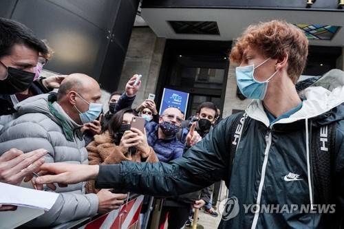 epa09587276 Jannik Sinner (R) of Italy signs autographs for fans in front of the Principi di Piemonte hotel in Turin, Italy, 17 November 2021. Sinner will face Daniil Medvedev of Russia in their group stage match of the Nitto ATP Finals tennis tournament on 18 November 2021. EPA/Jessica Pasqualon