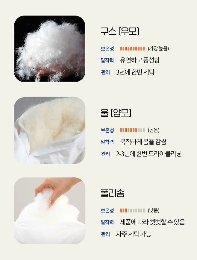 폴리에스터로 만든 일반 솜은 아무래도 합성섬유이다 보니, 구스나 울처럼 섬유 자체가 온기를 머금는 구조가 아니어서 보온성은 제일 낮아요.