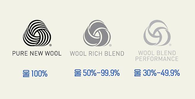 울마크는 국제 품질 규격으로, 30%, 50%, 100%의 로고가 각각 다르게 생겼답니다. 울 함유량이 많을수록 고급 제품이고 가격대도 높아진다고 생각하면 돼요.