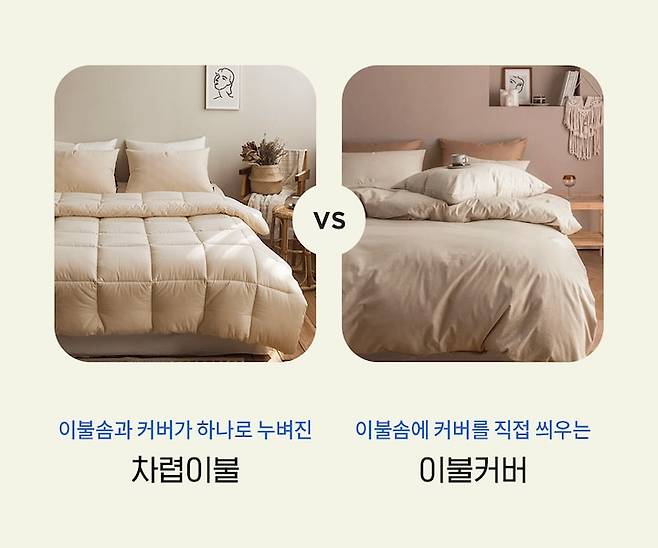 차렵이불을 선택하느냐, 이불커버를 선택하느냐에 따라 크게 달라져요. 먼저 이것부터 정해볼까요?