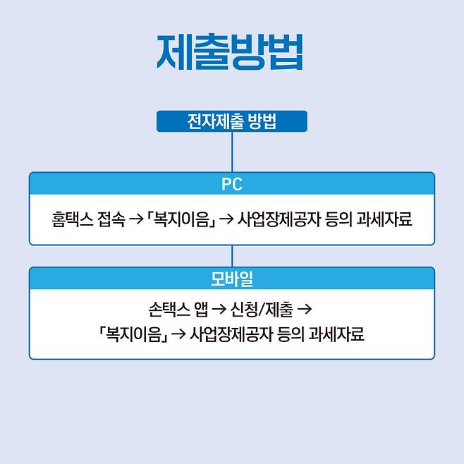 ● 전자제출 방법PC - 홈택스 접속 →「복지이음」→ 사업장제공자 등의 과세자료모바일 - 손택스 앱 → 신청/제출→「복지이음」→ 사업장제공자 등의 과세자료