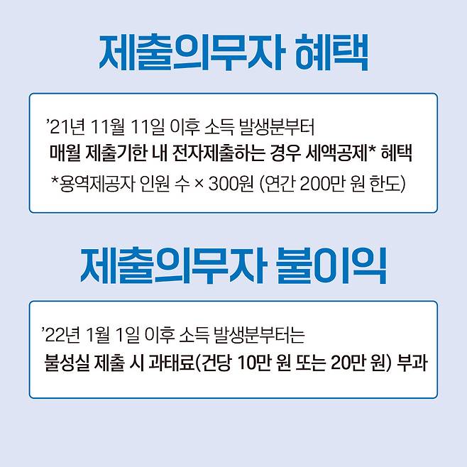 '21년 11월 11일 이후 소득 발생분부터매월 제출기한 내 전자제출하는 경우 세액공제* 혜택*용역제공자 인원 수 x 300원 (연간 200만 원 한도)