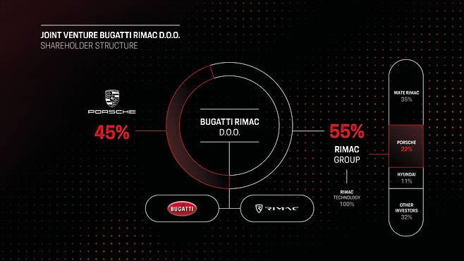 부가티-리막은 지난 7월 합작회사 계약체결 이후 4개월 만에 자동차 업계에서 가장 기대받고 있는 협력 프로젝트다. 크로아티아 스베타 네델자 (Sveta Nedelja)에 본사를 둔 부가티-리막의 CEO에는 리막 오토모빌리 설립자 겸 대표, 전기 하이퍼카의 선구자 메이트 리막(Mate Rimac)을 선임했다. 포르쉐는 전략적 파트너로서 역할을 맡고, 올리버 블루메 포르쉐 이사회 회장과 루츠 메쉬케 포르쉐 이사회 부회장 및 재무 이사가 감사회 위원직을 맡는다. 리막은 부가티-리막의 지분 55%를, 포르쉐는 45%를 각각 보유한다. 합작 회사의 형태로써 부가티와 리막은 각각 독립적인 브랜드 및 제조 기업으로 운영을 계속하며, 크로아티아 자그레브와 프랑스 몰샤임에 위치한 각 회사의 생산 시설 및 유통채널은 그대로 유지한다.