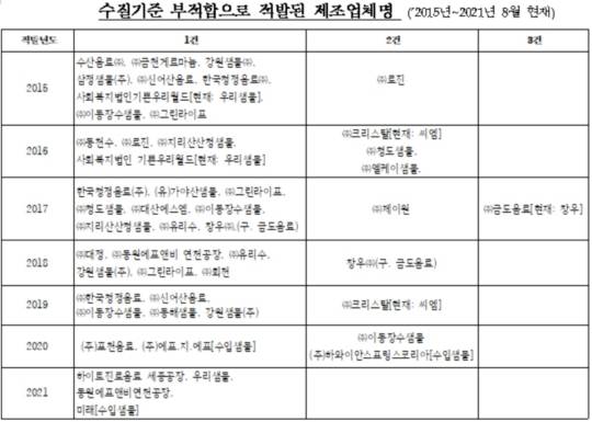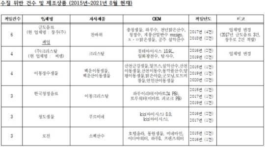 지금 언급된 곳 외에도 2015년부터 2021년까지 수질기준 미달로 2번 이상 행정처분을 받은 제조업체에 대해선 자사제품과 OEM으로 납품하는 상품까지 표로 정리해서 올려둘 예정입니다.