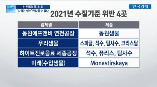 더불어 수입샘물 판매업자 1곳(미래)도 수질 기준 위반으로 적발됐습니다.