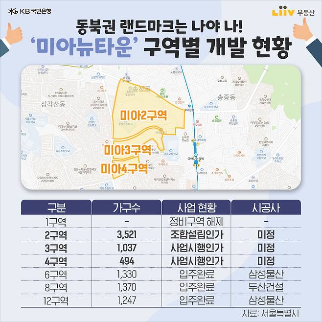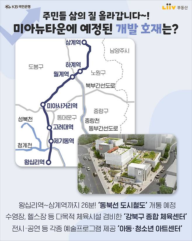 그동안 많은 사람에게 낙후 지역으로 인식되었던 동북권이 새롭게 바뀌고 있습니다. 특히 대규모 뉴타운 사업을 진행 중인 ‘미아뉴타운’ 중 재정비촉진지구인 2·3·4구역이 사업에 속도를 내면서 수요자의 관심이 집중되고 있는데요. 현재 동북권에서 가장 핫한 재개발 사업지, 미아뉴타운을 KB국민은행 리브부동산이 집중 분석해 봤습니다.