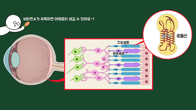 밝은 곳에서 어두운 곳으로 이동한 직후에는 눈을 뜨고 있어도 사물을 제대로 구별할 수 없습니다. 시간이 지나 눈이 어둠에 적응해야 사물을 구별하기 시작하는데, 어두운 곳에서 사물을 구별하기 위해서는 비타민A로부터 생성된 레티날(retinal)과 ATP에너지를 활용해서 망막의 간상세포에 존재하는, 붉은색의 빛을 감지하는 단백질 '로돕신(rhodopsin)'을 합성해줘야 합니다.