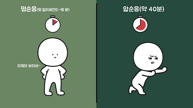 어쨌든 밝은 곳에서 어두운 곳(암순응)으로 이동하거나 어두운 곳에서 밝은 곳(명순응)으로 이동할 때는 눈이 환경에 적응하는 시간이 필요합니다. 시간으로 보면 명순응은 몇 밀리세컨드(~ms, 1밀리세컨드 : 1000분의 1초)에서 몇 분 정도가 필요하고, 암순응은 약 40분 정도가 필요하다고 알려졌는데, 그 시간 동안 완전히 보이지 않는 것은 아니므로 일상에 불편을 겪지는 않습니다.