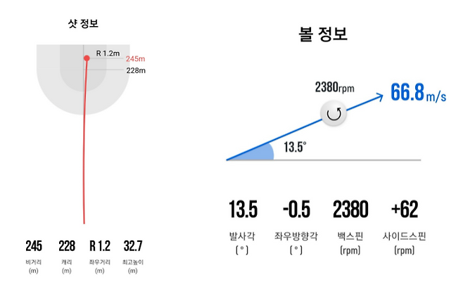 대략적으로 제 기준으로 16~18도의 론치 앵글을 보여줬고 백스핀은 2400rpm ~2700rpm 발생하였습니다. 필드에서 사용해보니! 비행하다 상승하는 샷이 주로 나오고 실질적인 비거리는 230~240m 정도 나오는 듯합니다.