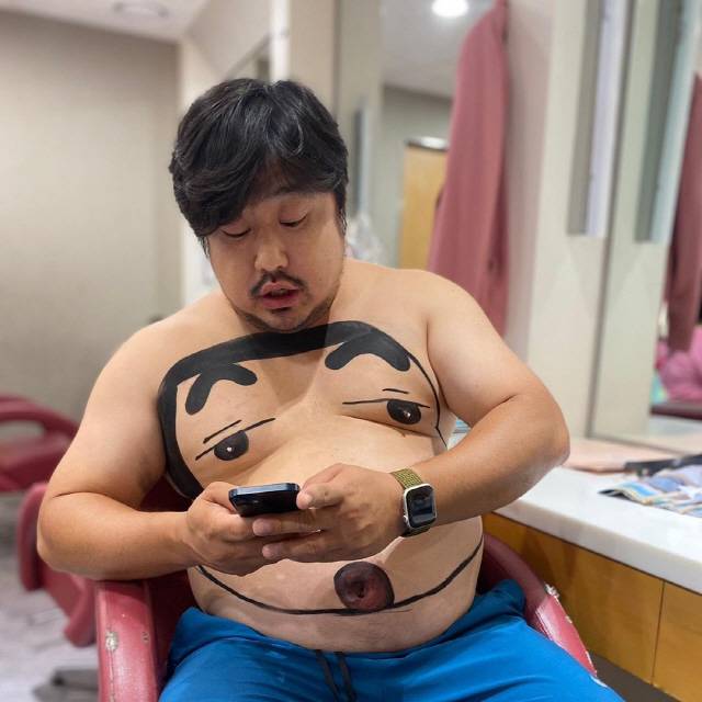 공개된 사진 속에는 상의탈의를 하고 가슴과 배에 애니메이션 짱구의 얼굴을 그려 충격을 안겼다.