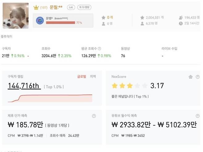 유튜브 수익도 만만치 않았다. 녹스 인플루언서에 따르면 현재 21만 구독자를 보유한 문월의 한달 유튜브 수익은 최소 2900만에서 최대 5100만 원 수준인 것으로 추정된다.