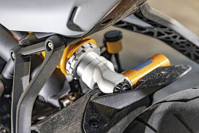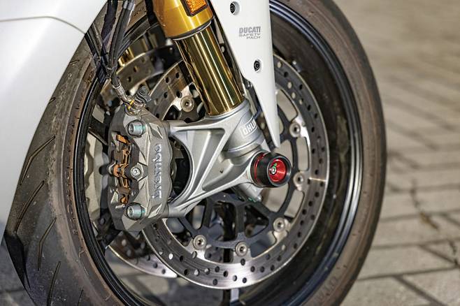 고사양의 S모델이기 때문에 기본으로 장착 된 올린즈 전후 서스펜션은 라이딩의 경험을 한 단계 높여준다. 타이어의 그립을 확실히 느끼게 해주는 서스펜션의 역할을 충실히 해내며 슈퍼스포츠라는 이름에 맞는 날카로운 코너링을 보여준다. 온로드 모델치고는 서스펜션의 작동 폭이 전륜 130mm 후륜 144mm로 여유가 많고 덕분에 승차감도 나쁘지 않다. 핸들링은 무척이나 중립적이다. 바이크를 끌고 당기지 않아도 원하는 만큼 방향을 바꾼다. 고갯길에서 행오프로 적극적으로 당기며 타도 즐겁지만 린위드로 설렁설렁 기울여가며 달려도 충분히 빠르다.
