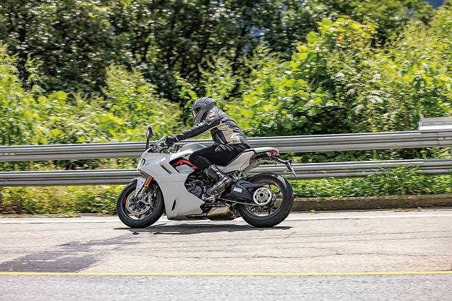 공기를 효과적으로 가르는 페어링 덕분에 고속 영역에서의 안정감은 몬스터에 비해 확실히 우위를 점한다. 특히 높이 조절이 되는 윈드쉴드는 고속에서 무척 유용했다. 그래서 전반적인 퍼포먼스는 몬스터가 좋았지만 슈퍼스포츠가 고속영역에서는 확실히 몬스터를 압도한다. 그리고 무게 덕분에 오히려 타기 쉽게 느껴지는 점도 재밌었다. 어지간해서는 바이크에 끌려 다니는 느낌을 주지 않기때문이다. 전반적인 주행에서 두카티 바이크 중 가장 자극이 적고 편안하게 탈 수 있는 모델이었다.
