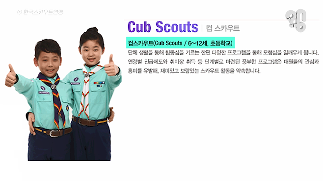 끝으로 보이스카우트. 생각보다 많은 사람이 보이스카우트와 걸스카우트와 합쳐 컵스카우트가 됐다고 잘못 인식하고 있다. 보이스카우트가 2001년 명칭을 ‘한국스카우트연맹’으로 바꾸고, 2002년부터 여자 단원을 받기 시작한 것은 맞다. 하지만 걸스카우트는 한국스카우트연맹과 별개 조직이고, 컵스카우트는 보이스카우트 내에 6~12세 단원들을 가리키는 말이다. 그러니 보이스카우트가 ‘보이’를 빼고 스카우트가 됐다는 표현이 정확하다. ‘보이스카우트-남중-남고-공대-군대’ 이런 드립 치면 최소 30대 중반 이상이라는 얘기. 스카우트도 현재는 비대면으로 텐트 치기, 매듭짓기 등 야영 강의를 제공하고 있는데 2023년 전세계 스카우트연맹 단원이 모여 열리는 ‘잼버리’ 행사는 코로나가 종식된 대면 속에서 이뤄지기를 학수고대하고 있다고 한다.