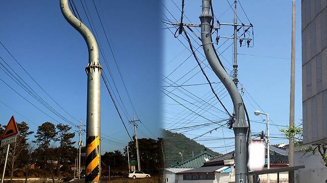 다시 ‘곡선형 강관 전주’라는 이름에 주목해 보자. 전주의 종류 중에는 철근과 콘크리트로 만들어진 콘크리트주와, 강관으로 만들어진 강관주가 있다. 우리가 일반적으로 떠올리는 곧은 전봇대는 대부분 콘크리트주고, 휘어진 전봇대는 바로 ‘곡선형’의 ‘강관 전주’다.