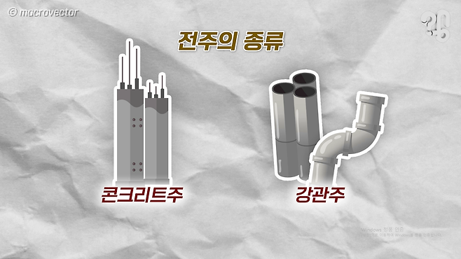 강관은 철로 된 관이라 해서 강관이거든요. 쉽게 예를 들면 쇠파이프 있죠. 그 쇠파이프가 좀 두꺼운 거라고 생각하시면 돼요. 콘크리트 전주는 그 안에 철근이 들어가 있는데 철근을 휘면 강도가 안 나오기 때문에 강관주를 사용하죠.