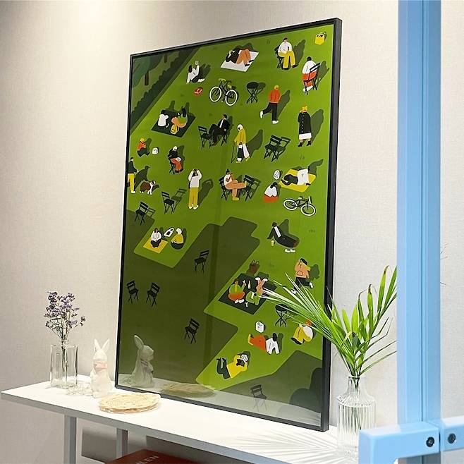 복도에 놓은 벽난로 콘솔 위에는 액자가 있습니다. 그림 구독 서비스 핀즐을 이용 중인데요. 한 달에 한 번 액자의 그림을 교체하며 계절 그리고 시간의 흐름을 느끼는 중입니다.