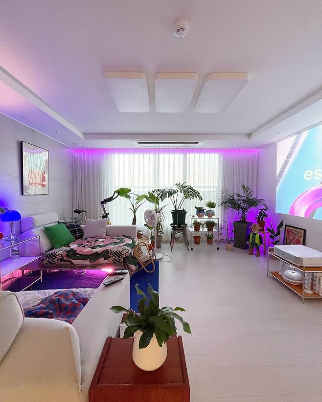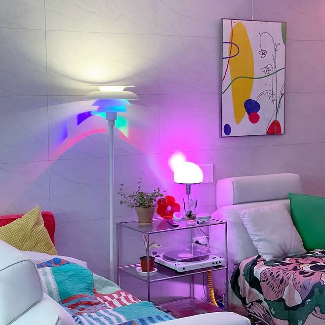 소파 역시 저희 집 콘셉트에 맞게 독립적으로 두고 나눠 앉습니다. 거실에서는 IoT 기능을 활용한 전동 커튼 및 각종 조명, 스마트 온도계 등을 사용하고 있어 매우 편리해요! 조명은 시간대별로 분위기에 맞게 컬러를 바꿔가며 쓰고 있어요.