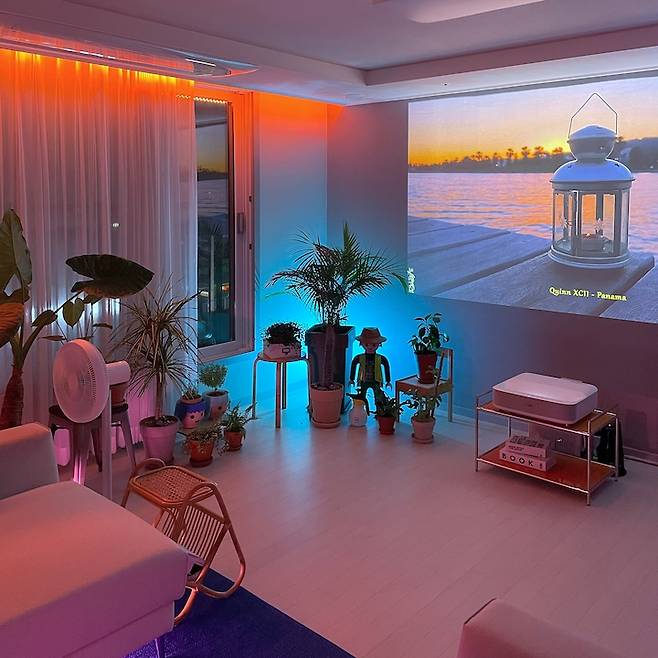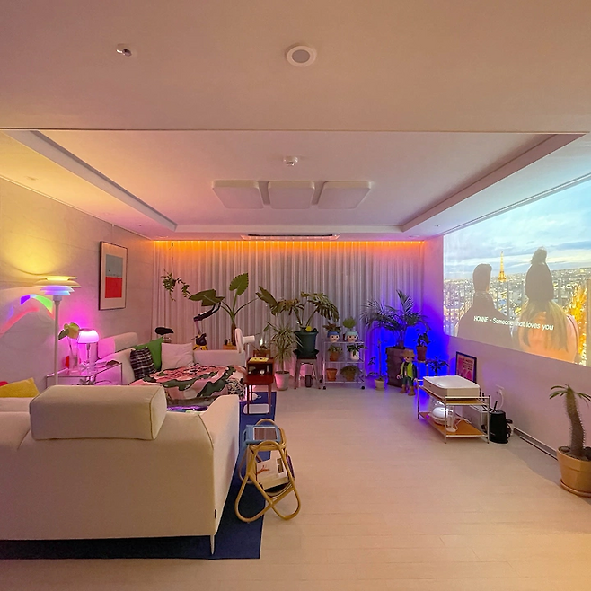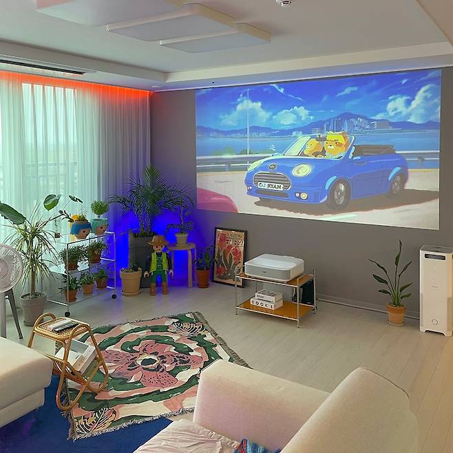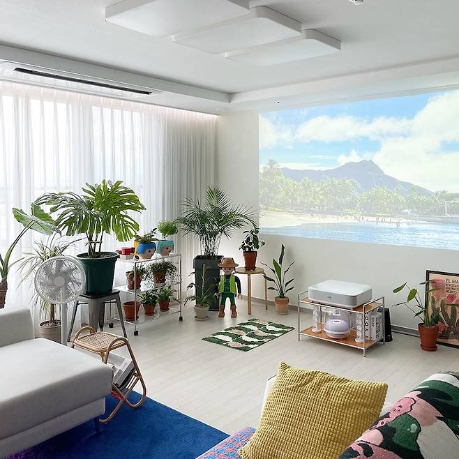 저희 집 거실에는... TV가 없어요. TV냐, 빔프로젝터냐... 아내와 많은 고민을 하다가 결국 빔 프로젝터를 쓰게 됐습니다. 낮에도 볼 수 있는 밝고, 선명한 화질의 단초점 빔 프로젝터를 사용하고 있어요. 영화를 좋아하는 아내의 최애템입니다.