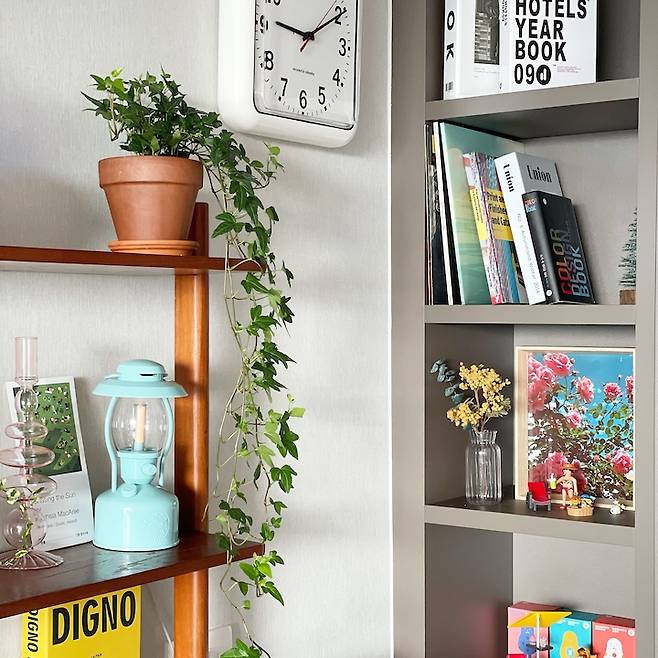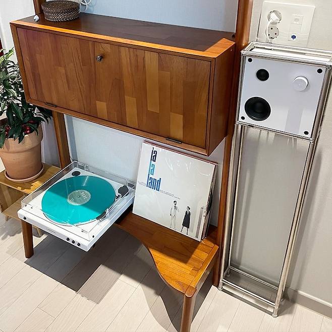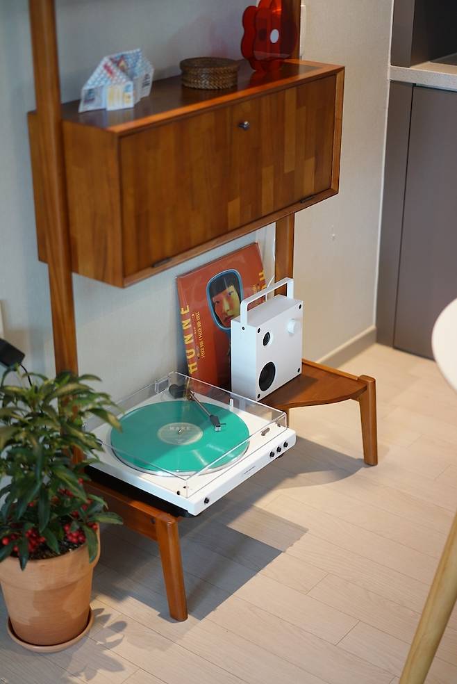 커피 마실 때 자주 사용하는 LP 플레이어와 전용 스피커입니다. 덕분에 홈 카페 느낌이 물씬 나는 거 같아요! LP에 관심 있으신 분들... 정말 강추 드려요!!! 스피커 스탠드는 모듈 가구로 만들고 싶어 직접 사이즈별 주문하여 DIY로 제작했습니다. 만족도가 매우 높아서 손재주 좀 있으신 분이라면... 강추 드립니다! 이뻐요!
