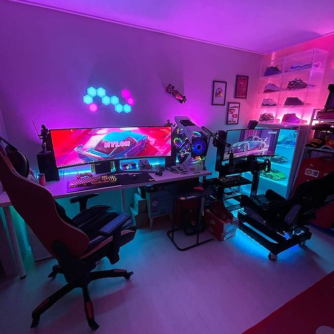 방에 들어서면 가장 먼저 저의 작업 공간이자 게임하는 공간이 펼쳐집니다. 49인치 울트라 와이드 모니터와 컴퓨터, 그리고 레이싱 게임 시트는 화려한 조명이 감싸고 있습니다. 방에 스마트 전구는 총 4개, 스마트 LED 라인은 5개로... 책상 / 모니터 뒤 / 레이싱 시트 / 장식장 / 신발장 / 커튼 박스 등에 설치되어 있습니다.