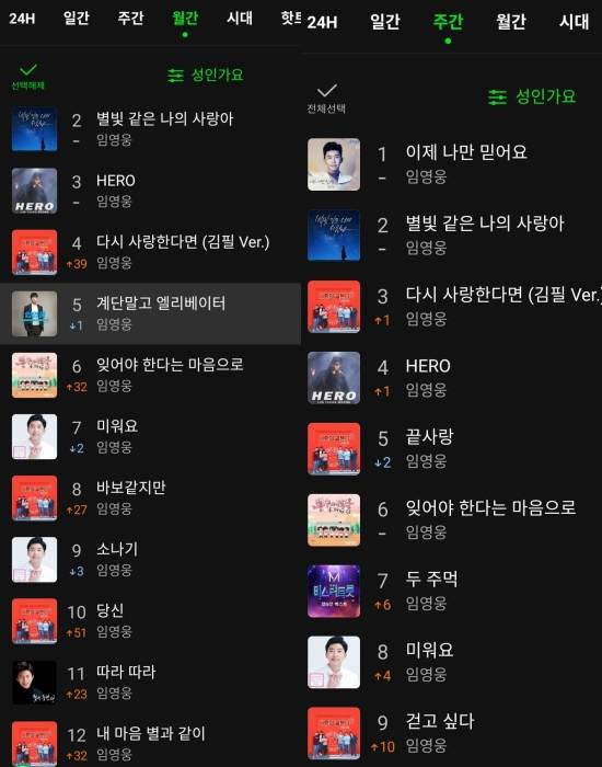 6월에 이어 7월도 멜론 성인 가요차트를 지배하고 있는 임영웅.