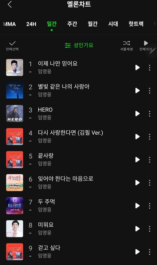 임영웅이 멜론 성인가요 차트를 장악 중이다.