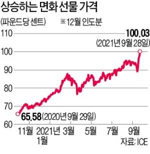 28일(현지시간) 뉴욕국제선물거래소(ICE)에서 12월 인도분 면화 선물 가격은 파운드당 100.03센트로 전날보다 2.02% 상승 마감했다. 장중엔 파운드당 101.55센트까지 치솟아 2011년 11월 이후 최고가를 기록했다. 면화 가격은 올 들어서만 28% 올랐다. 이날까지 6거래일 연속 상승세다.