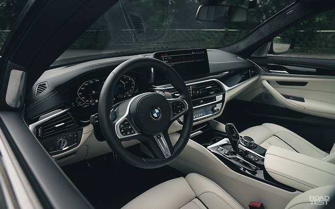 M550i 실내 기본 구성은 일반 5시리즈와 같다. 530마력 화끈한 차지만 ‘고성능’ 보다는 ‘럭셔리’이미지를 추구한다. 시트와 도어 안쪽 패널 대부분을 천연가죽으로 감싸는 등 더 고급스러운 재질과 컬러로 아랫급 모델과 차이를 둔다. 이번에 탄 차는 크림색 시트와 피아노 블랙 내장재의 강렬한 대비를 통해 역대 5시리즈 중 가장 부유한 분위기를 뽐낸다.