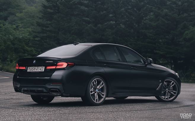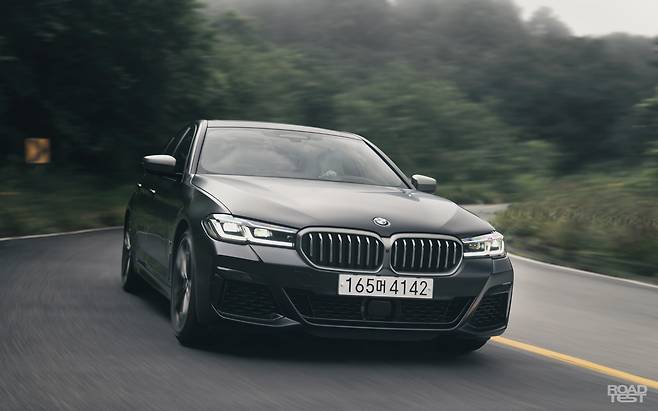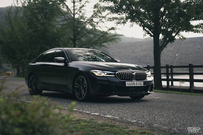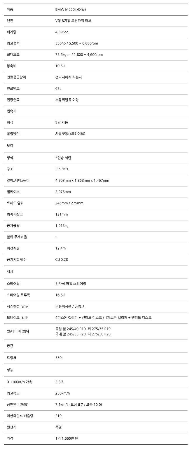 이번에 만난 M550i xDrive(이후 x드라이브)는 V8 4.4L 엔진이 최고출력 530마력, 최대토크 76.5㎏·m를 낸다. 평범한 5시리즈에 모터스포츠 감성을 흥건히 적신 고성능 모델이다. 국내 기준으로 540i와 5시리즈 ‘끝판왕’ M5 사이에 자리 잡았다. 625마력 M5는 너무 맵고 340마력 540i는 싱겁게 느껴지는 이들을 겨냥한다.
