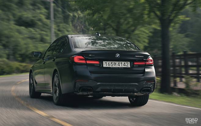 540i xDrive보다 차체 높이는 9㎜, 최저지상고는 8㎜ 낮다. 미세한 수치지만 실제 눈이 느끼는 안정감은 사뭇 다르다. 앞뒤 범퍼는 새로 만들었다. 앞은 공기를 벌컥벌컥 들이켤 수 있게 흡기구를 키웠고, 뒤는 공기 흐름을 결결이 찢어 소용돌이 막을 디퓨저를 더했다. 그릴과 사이드미러 캡, 측면 공기 배출구 컬러도 새로 입혔다. 트렁크 끝에는 얇은 리어 스포일러를 덧대 역동적 이미지를 더했다.