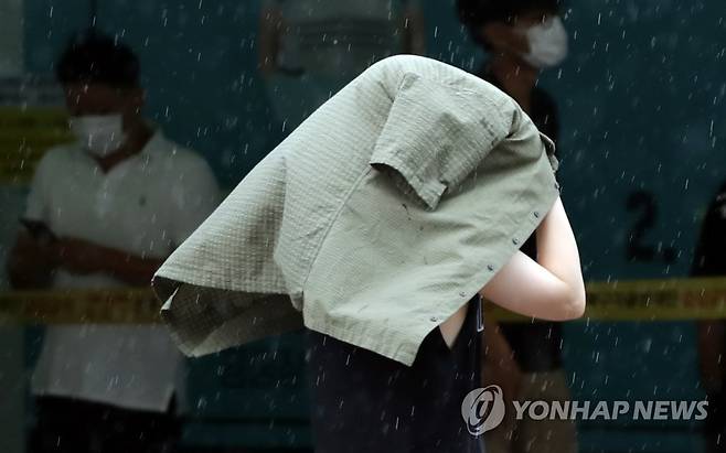 (서울=연합뉴스) 한상균 기자 = 비가 내린 18일 오전 서울 시내에서 한 시민이 옷을로 비를 피하고 있다. 2021.8.18