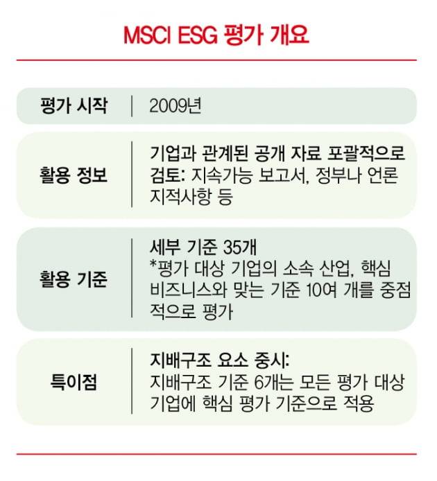 MSCI의 ESG 평가를 설명할 때 빼놓을 수 없는 것은 ESG 요소 중 지배구조를 중시한다는 점이다. 이사회 구조, 급여, 소유와 경영의 분리 등 오너십, 회계, 투명한 납세, 기업 윤리 등 지배구조를 평가하는 기준 6개는 평가 대상 기업의 비즈니스 모델이나 소속 산업에 관계 없이 핵심 기준으로 본다. MSCI는 ESG 평가를 시작한 이래 지속적으로 “좋은 지배구조는 기업의 효율적인 자원 분배 및 의사결정을 위한 열쇠”라며 “지배구조를 잘 관리하는 기업이 장기적으로 지속 가능성을 담보할 가능성이 크다”고 강조해 왔다.