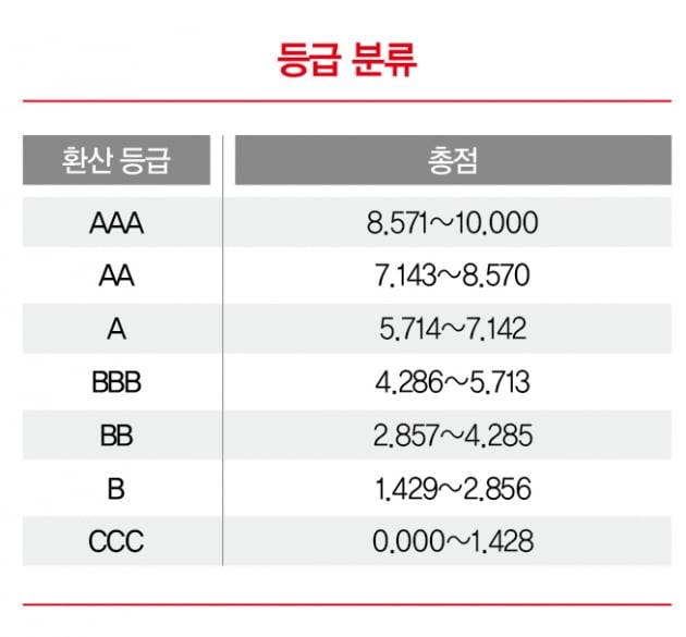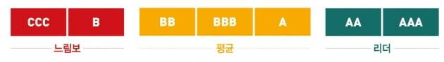 기업이 최종적으로 부여받는 것은 점수가 아니라 AAA, AA, A, BBB, BB, B, CCC 등 7개 등급이다. AA나 AAA를 받은 기업은 ESG로 인한 기회와 위기를 잘 관리하는 ‘리더’로, A, BBB, BB 기업은 ‘평균’으로, B와 CCC를 받은 기업은 ESG 리스크를 제대로 관리하지 못해 위기에 처할 위험도가 높은 ‘느림보’ 기업으로 분류된다.