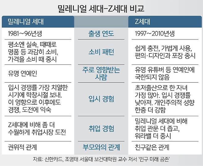 밀레니얼세대와 Z세대는 대학 입시나 취업 등의 사회적 경험을 뜻하는 ‘코호트’가 전혀 다르다. 아직은 한국의 출산율이 일정 이상을 유지하던 시기에 태어난 밀레니얼세대는 가장 치열한 입시경쟁을 치러야 했다. 반면 출산율이 1점대, 0점대인 상황에서 태어난 Z세대들은 밀레니얼세대에 비해 대학 입시경쟁률이 훨씬 낮았다. 이런 상황을 겪다 보니 두 세대는 자연스레 성향이 달라질 수밖에 없다.