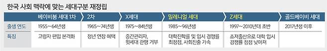 조 교수는 “미국은 2차 세계대전(1945년 종료) 전후부터 64년생까지를 베이비붐 세대로 규정한다. 반면 우리나라는 한국전쟁까지 겪었기에 베이비붐 세대를 휴전 후인 1955년생부터로 봐야 한다. 게다가 우리나라는 베이비붐 세대가 20년 정도로 꽤 길게 유지되기 때문에 1955∼64년생까지는 베이비붐 1세대, 출산율이 다소 떨어진 1965∼74년생까지를 베이비붐 2세대로 봐야 하는 것도 미국과는 다른 점이다”며 “이렇게 되면 자연스레 미국의 X세대나 밀레니얼세대와 달리 우리의 그것은 연도가 조금씩 뒤로 밀려야 한다”고 설명했다.