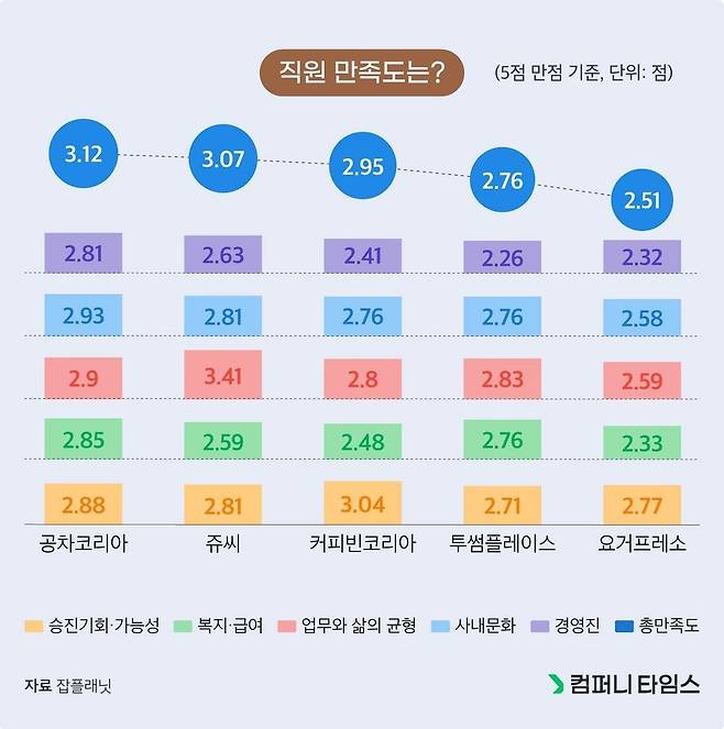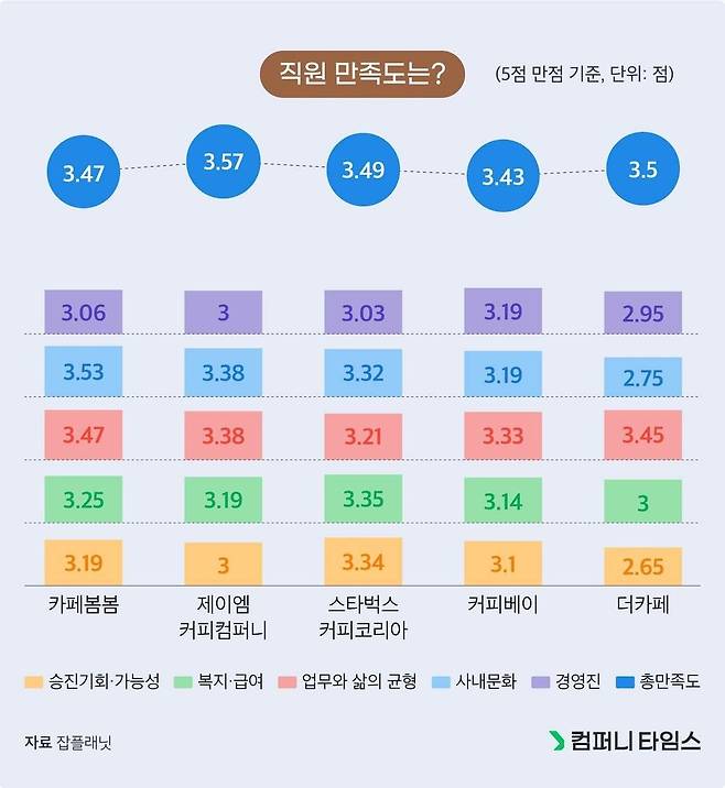 이 어려운 와중에도 지난해 조직원들에게 좋은 평가를 받은 회사를 찾았다. '일하기 좋은 커피 회사' 종합 순위는 2020년 5월부터 올해 5월까지 전현직자가 남긴 총만족도 점수와 △복지·급여 △승진 기회·가능성 △워라밸(업무와 삶의 균형) △사내문화 △경영진 평가 등을 반영했다. 만점은 10점이다.