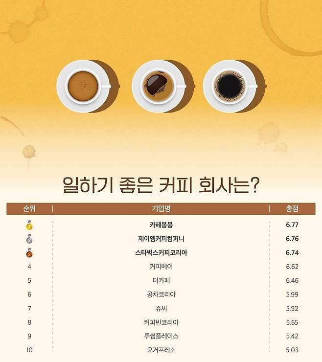 이 어려운 와중에도 지난해 조직원들에게 좋은 평가를 받은 회사를 찾았다. '일하기 좋은 커피 회사' 종합 순위는 2020년 5월부터 올해 5월까지 전현직자가 남긴 총만족도 점수와 △복지·급여 △승진 기회·가능성 △워라밸(업무와 삶의 균형) △사내문화 △경영진 평가 등을 반영했다. 만점은 10점이다.