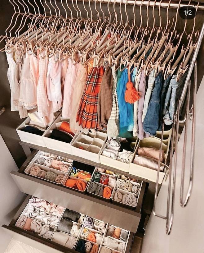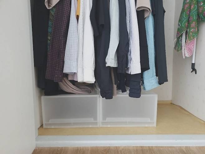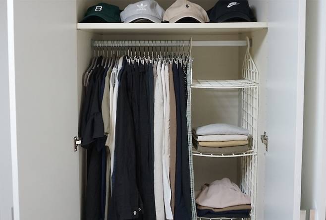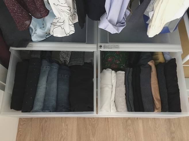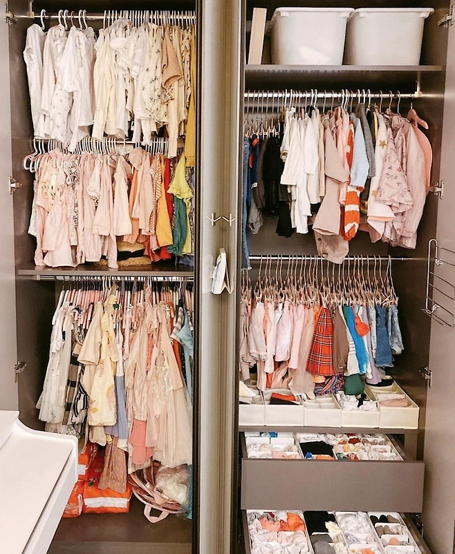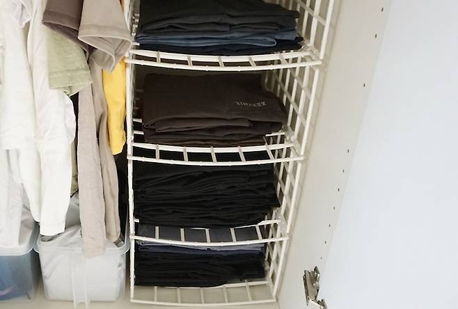 이렇게 정리하니 칸이 분류되어서 옷을 찾기도 쉽고 공간 활용도도 높아졌어요 ㅎㅎ