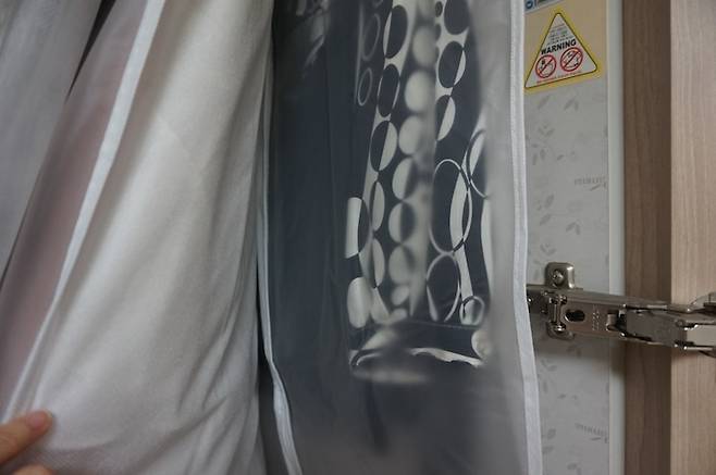 제가 사용하는 의류커버는 뒷면은 부직포 재질이라 통기가 잘되고, 앞면은 두꺼운 비닐 재질이라서 굉장히 튼실해요. 이렇게 살짝 들춰보면 반투명이라 내용물을 확인하기도 쉽습니다.